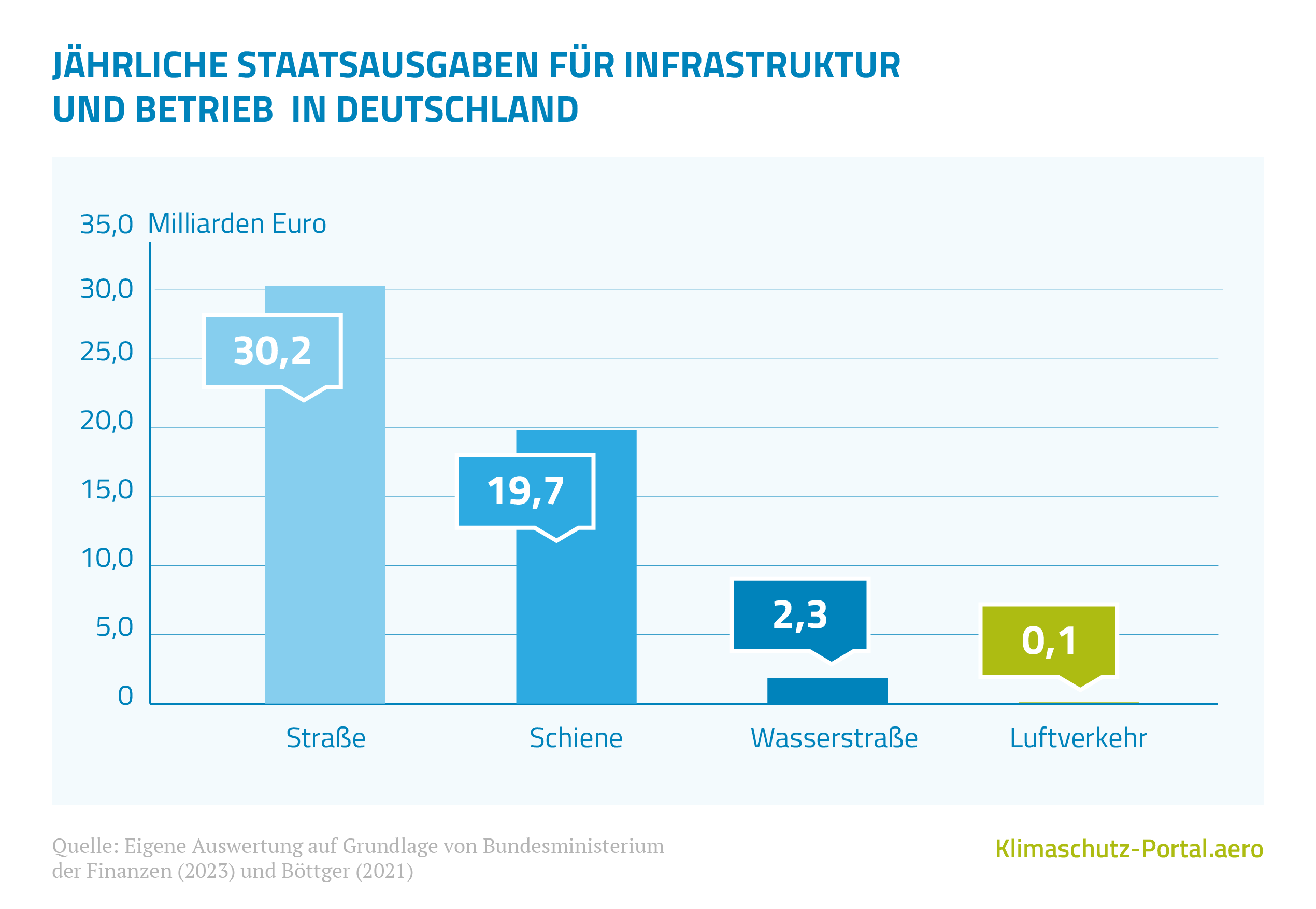 Ein Blick auf die Finanzierung aus Steuermitteln in Deutschland zeigt, dass der Luftverkehr unter allen Verkehrsträgern mit Abstand die wenigsten staatlichen Zuwendungen für Betrieb und Infrastruktur erhält. Dies zeigt, dass der Luftverkehr in Deutschland fast vollständig nutzerfinanziert ist, von einer Subventionierung kann also keine Rede sein.