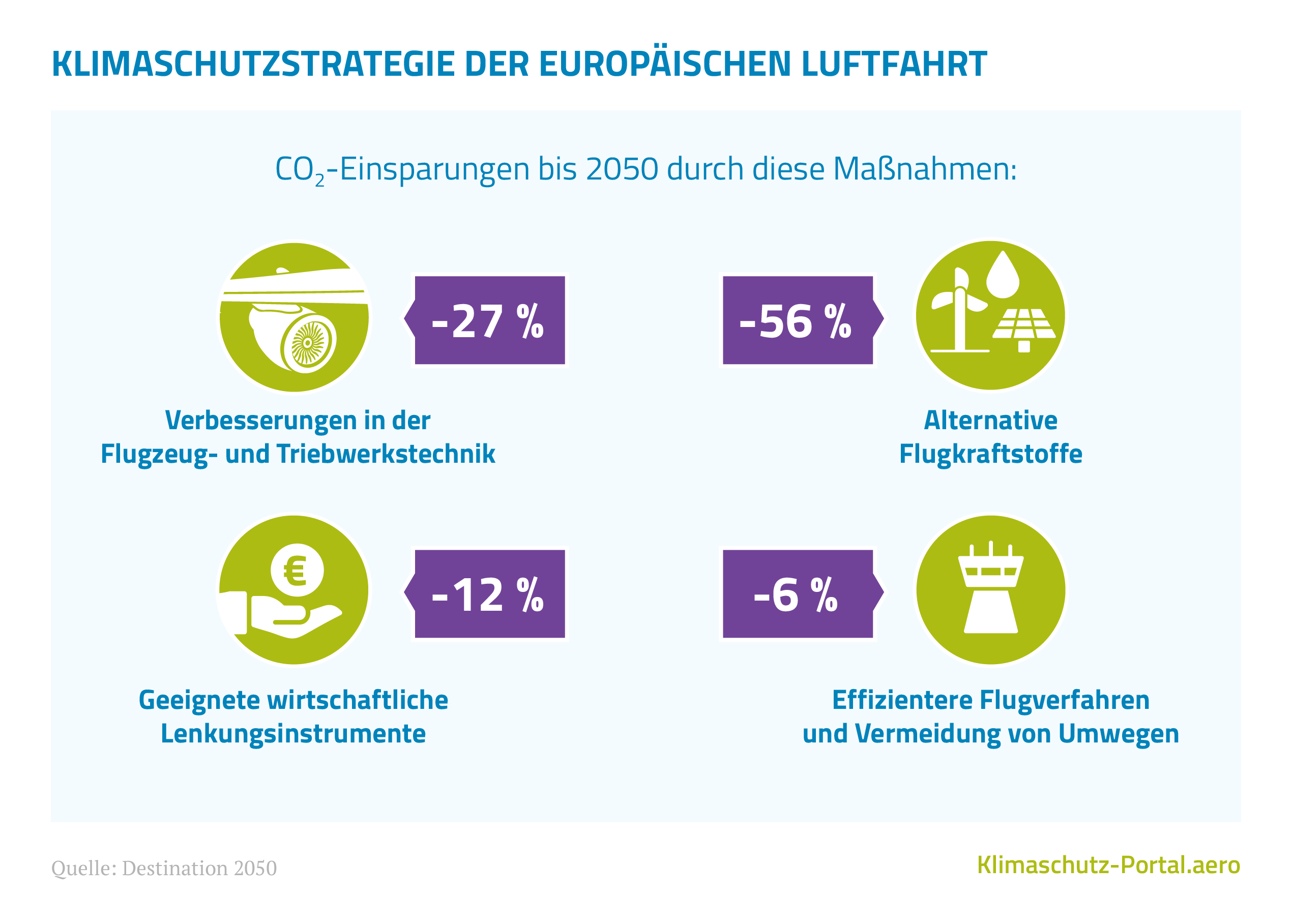 Die Roadmap für „Destination 2050“ zeigt, wie trotz eines prognostizierten Wachstums von durchschnittlich 1,4 Prozent pro Jahr der Luftverkehr in Europa bis 2050 CO2-neutral gestaltet werden kann. 85 Prozent der Emissionen, oder prognostizierte 250 Millionen Tonnen CO2 im Jahr 2050, können dabei direkt durch Handlungen in den vier Kernbereichen reduziert werden. Die verbleibenden 15 Prozent der CO2-Emissionen werden den Autoren zufolge dadurch entfallen, dass sich Luftverkehr durch die Umsetzung der Kernmaßnahmen verteuert, und die Nachfrage entsprechend gebremst wird.