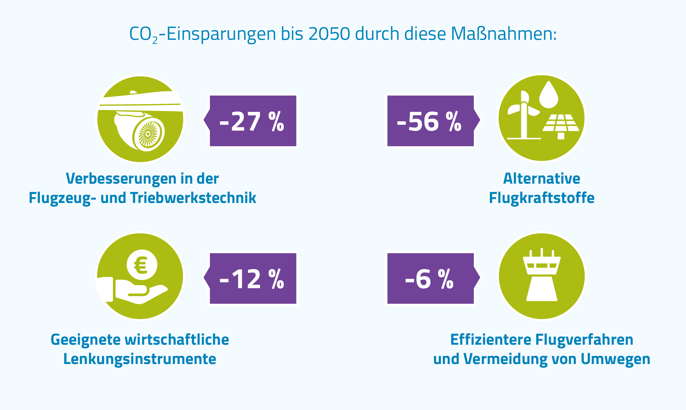 Effizientere Flugverfahren und Vermeidung von Umwegen: Weitere Verbesserungen im Flugbetrieb helfen, den Kraftstoffverbrauch und damit die CO2-Emissionen zu reduzieren. Dazu zählt zum Beispiel eine bessere Abstimmung zwischen Airlines, Flugsicherung und Flughäfen. Eine Umsetzung des SES kann helfen, Umwege und damit unnötige Emissionen zu vermeiden. Gleiches gilt für eine verbesserte Flugplanung und –vorbereitung. Auch am Boden können CO2-Emissionen reduziert werden, beispielsweise durch einen verringerten Triebwerkseinsatz beim Rollen oder die Nutzung von Bodenstrom anstelle der Hilfsturbine APU. So können die CO2-Emissionen um 6 Prozent reduziert werden, das entspricht 18 Millionen Tonnen CO2 im Jahr 2050.