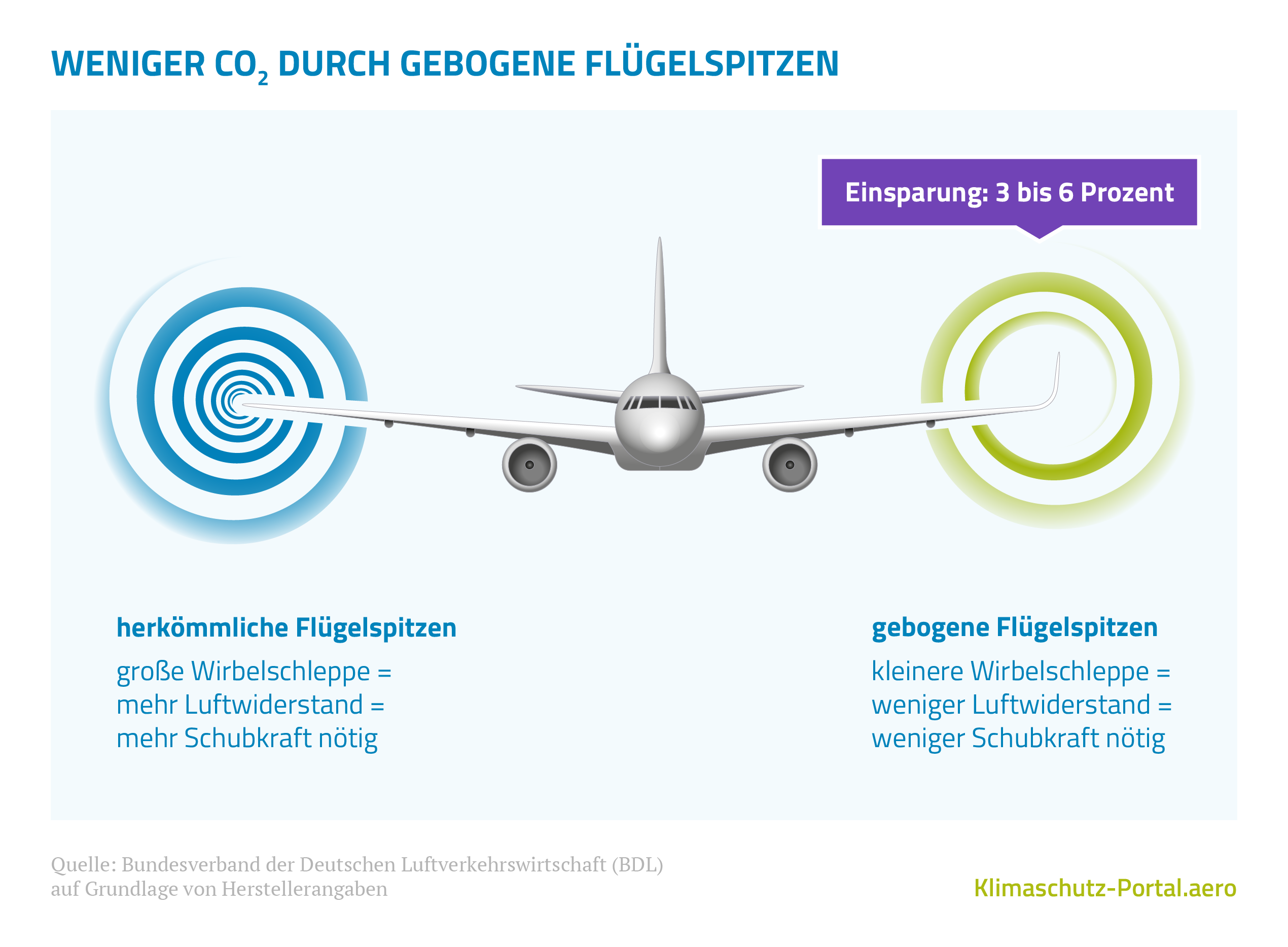 Es gibt verschiedene Varianten und Namen, je nach Hersteller oder ob es sich um eine nach oben oder zusätzlich auch nach unten gebogene Verlängerung des Außenflügels handelt. Die gebogenen Flügelspitzen reduzieren die Luftverwirbelungen und sparen dadurch Kerosin ein: im Durchschnitt drei bis sechs Prozent. Praktisch bedeutet das, dass ein Flugzeug durch gebogene Flügelspitzen im Jahr bis zu 900 Tonnen CO2 einspart.
