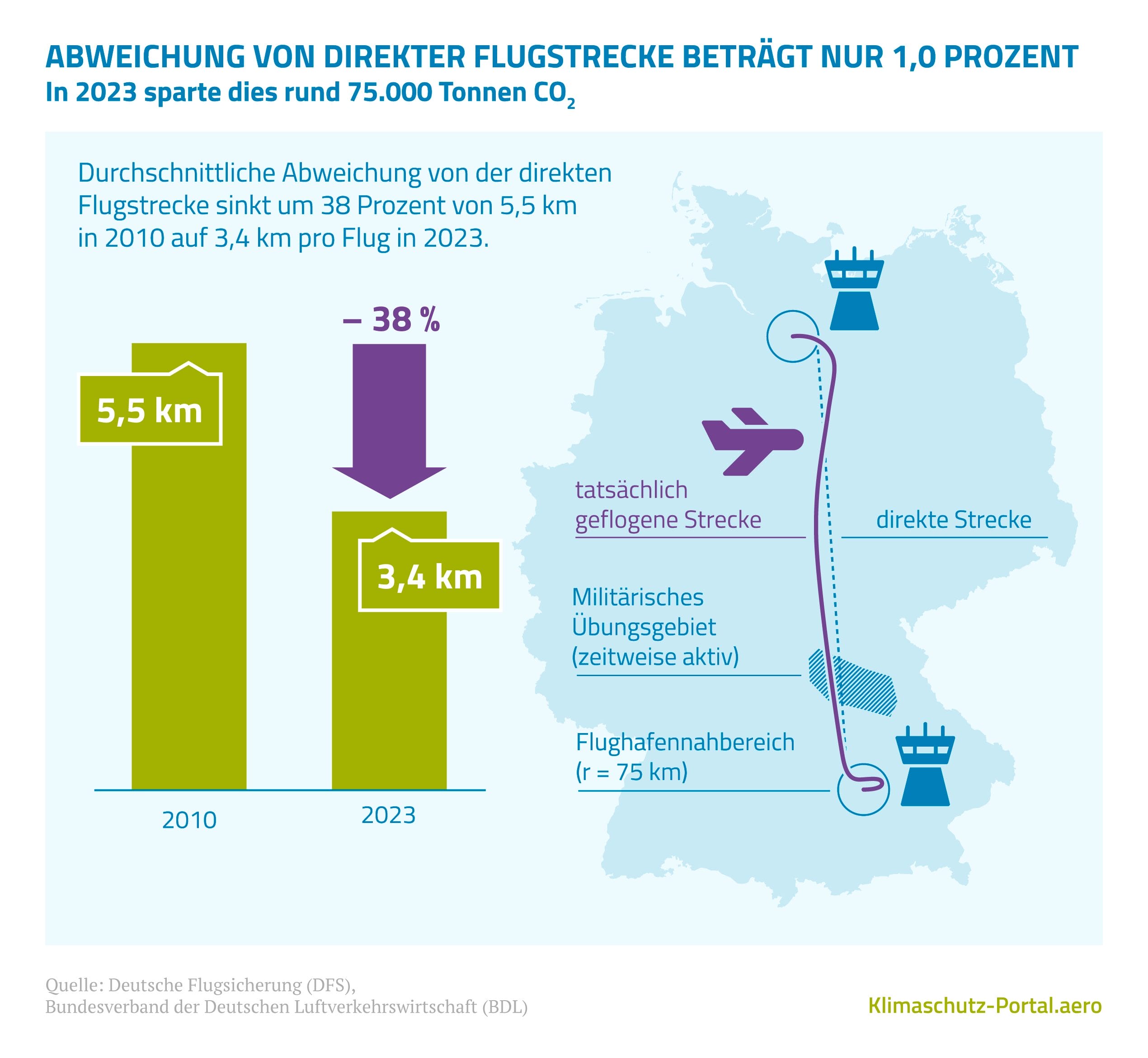 Je kürzer der Weg, desto geringer der Kohlendioxidausstoß – auf diese einfache Formel lässt sich das Bestreben bringen, in Deutschland und Europa die Flugzeuge so kurz wie möglich zu führen. In der Praxis ist das allerdings nicht ganz so einfach, denn auch im Luftraum kann man auf Hindernisse stoßen: Militärische Übungsgebiete oder Lärmvermeidung machen Umwege nötig.